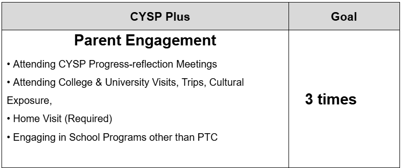 The CYSP program has “plus” categories with parent engagement: Bronze Plus, Silver Plus, and Gold Plus. The Plus categories are added to encourage parent engagement and participation in school activities and their scholars’ events. This component is not mandatory to achieve any of the three medals, but it will earn special recognition for the scholars who meet the requirements of this component. All 4th to 12th-grade parents or legal guardians are welcome to join the CYSP program. We encourage CYSP parents to participate in a variety of in-school and out-of-school CYSP-related activities, as well as school functions and events with their children, based on the chart below. Scholars will also earn plus recognition and extra prizes if their parents are recognized.